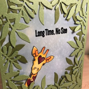 The giraffe stamp is from “Loved All Over” (Unity Stamps) and the sentiment is from “Giraffing Me Crazy” (My Favorite Things).The die is “Leafy Frame” from Simon Says Stamp.