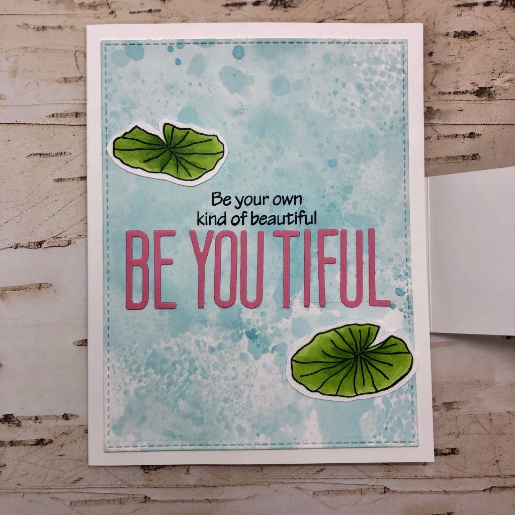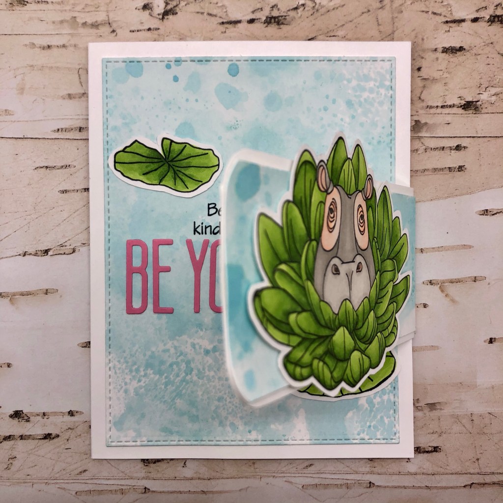 I started creating my card by doing some ink smooshing with the latest Distress Oxide Ink, Salvaged Patina. It’s such a pretty color and I thought it was a nice color for water. Next, I stamped the hippo and leaf images from The Rabbit Hole Designs, Hippo Botanical with Momento Tuxedo black ink and colored everything with Copic Markers. I really love how Fiona turned out💗 I fussy cut all of the images so I could “float” them in the water. I die cut my inked background with a stitched rectangle and adhered it to a side-folding A2 card base. I decided I wanted to die cut some letters to spell out “ be you tiful”. Next, I decided where everything was going to be placed, so I could stamp the sentiment from the Turtle Botanical stamp set. I adhered my leaves and letters and then worked on my card flap. I wanted the pretty hippo to hide the sentiment for a little surprise.