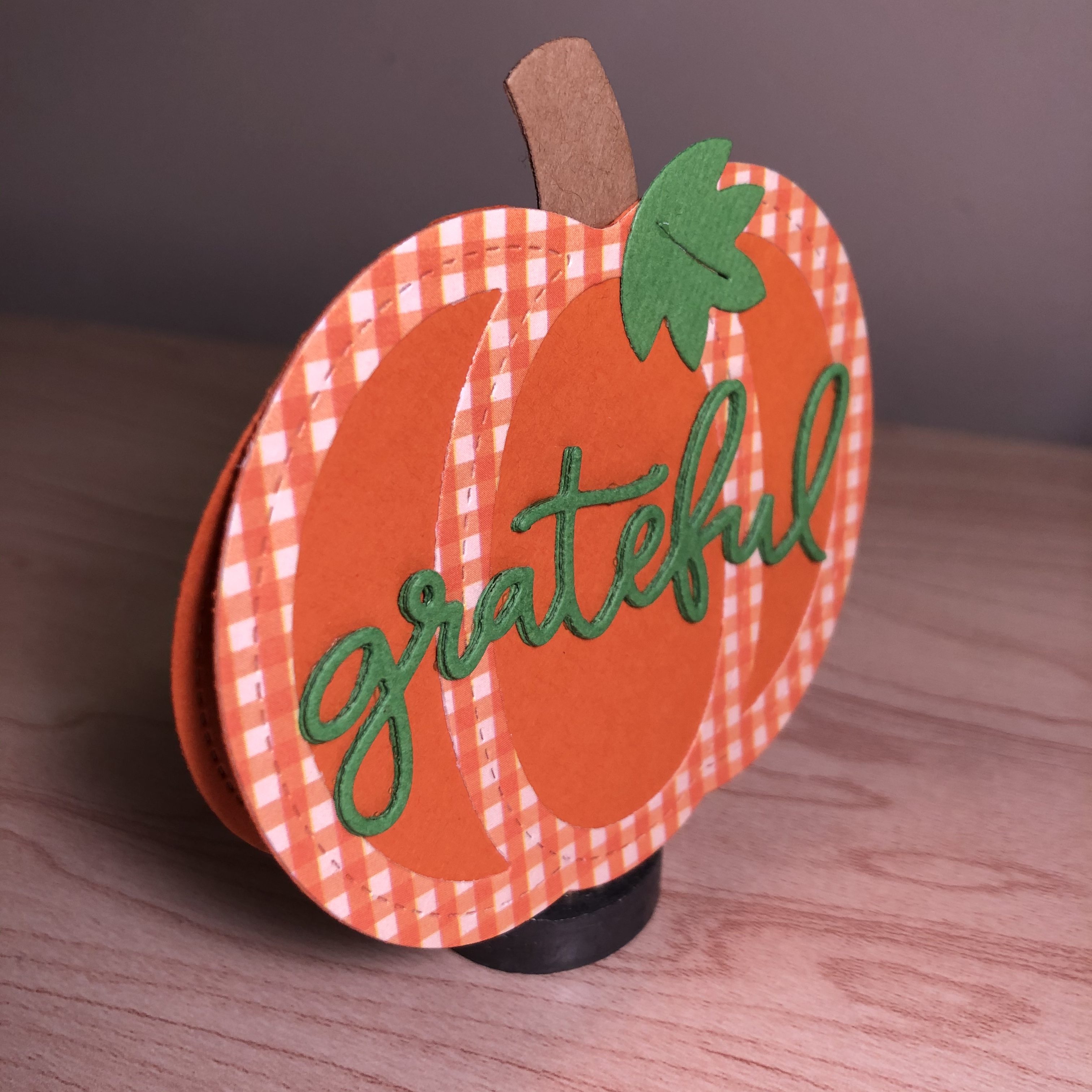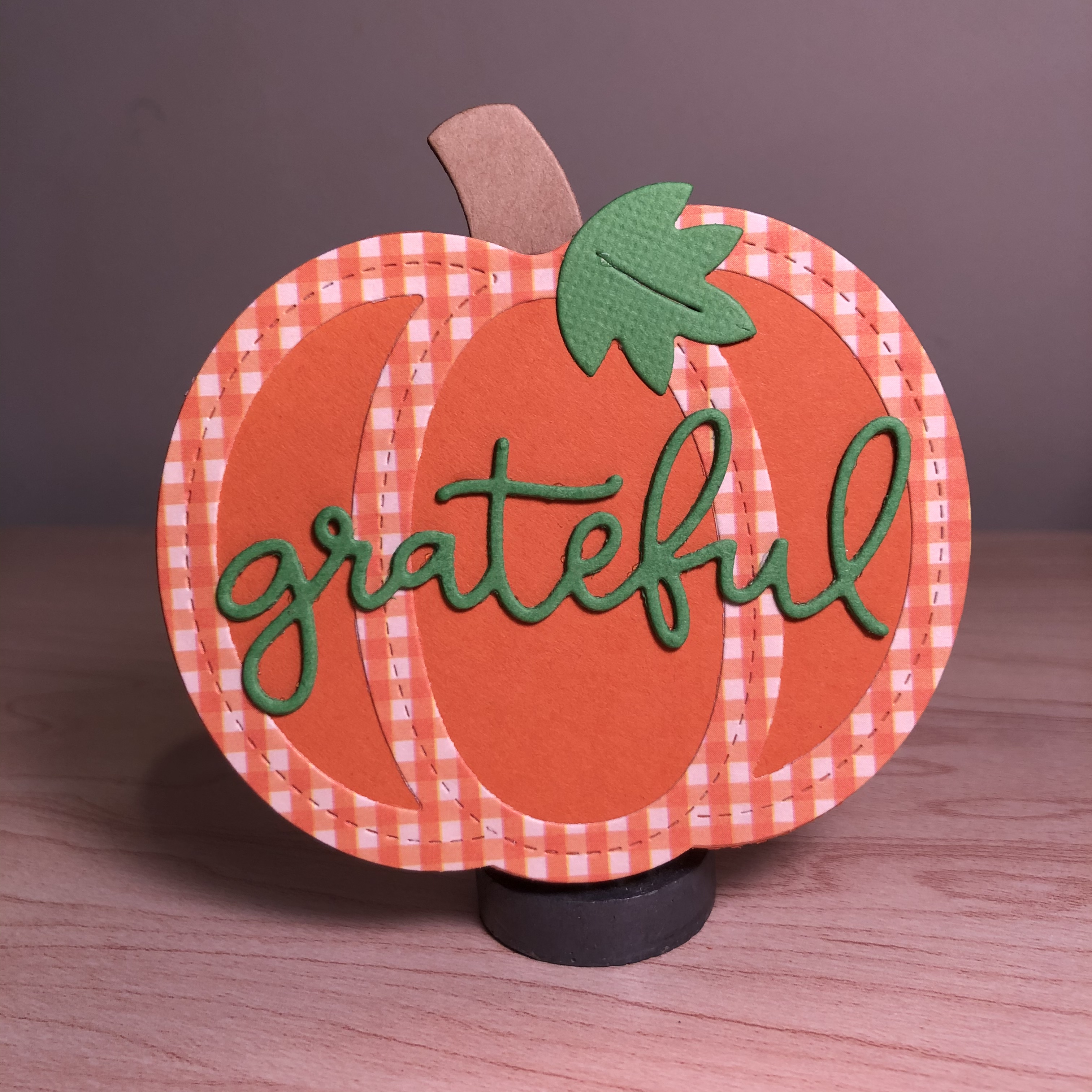 My goal was to make a simple, cute card. I needed to make several of these, so a quick card design was needed. This card came together so easily. I just die cut the pumpkin pieces and glued them together. I cut an additional pumpkin to attach to the top, back part of the pumpkin, to create the little card.