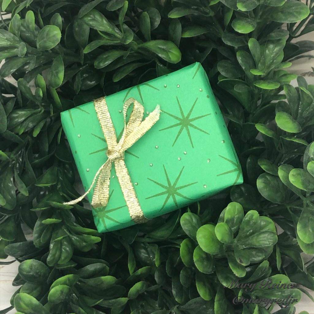 I was challenged to create something other than a card with this cling stamp. So, I stamped it onto green paper with GinaK Fresh Asparagas ink and used my gold gel pen on the dots. This made adorable gift wrapping – especially with the gold bow!