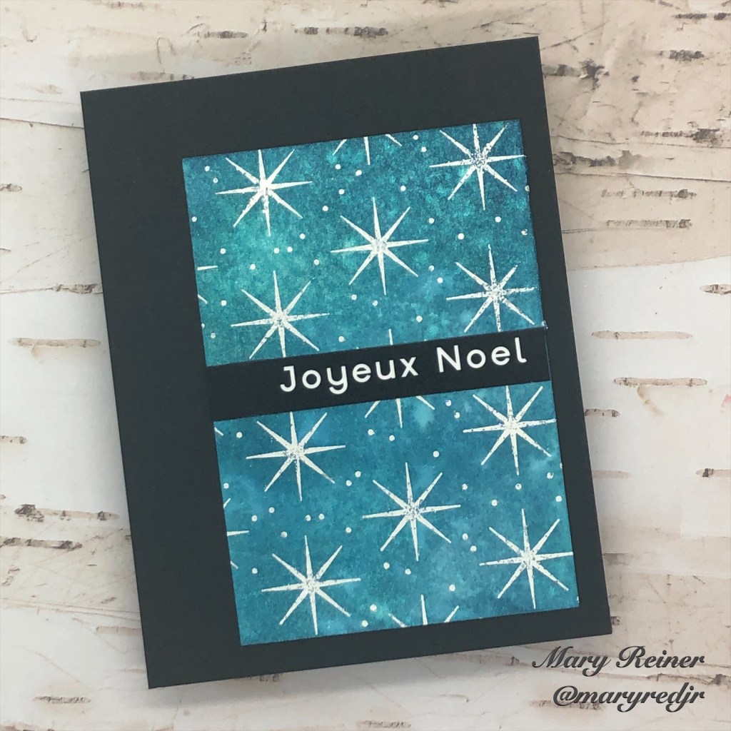 For my background, I sprayed Ranger’s Distress Mica Spray in Shiny Bauble and a bit of Merry Mint onto watercolor paper. I first misted the paper with water and then, layered on the mica spray. Let me tell you, that spray is magical! So shimmery and pretty! After it was completely dry, I inked up the cling stamp with embossing ink and then sprinkled on Ranger Snowflake Tinsel embossing powder. I decided I wanted lots of sparkle! After I embossed my background, I cut it down to 3″ x 4.5″. For my sentiment, I selected “Joyeux Noel” from Simon Says Stamp Reverse Christmas Wishes sentiment strips. Lastly, I adhered everything to a black panel and put it on a top folding A2 card base.